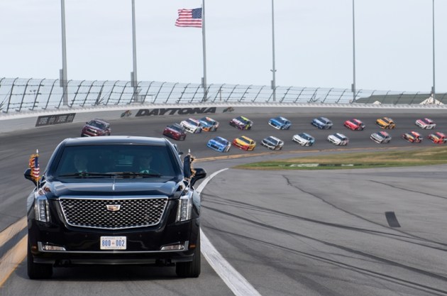 Donald Trump also took a parade lap around the two-and-a-half-mile speedway in his armored limousine, leading the 40-car field before the green flag. (Source: Reuters)