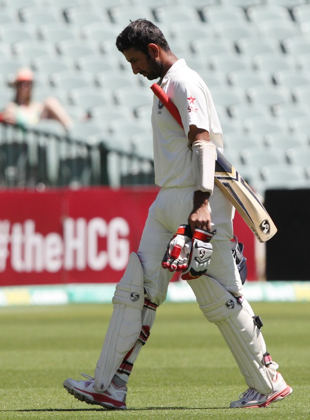 India's Cheteshwar Pujara succumbed to a turning delivery from Lyon after playing some lovely square cuts and drives. (Source: AP)