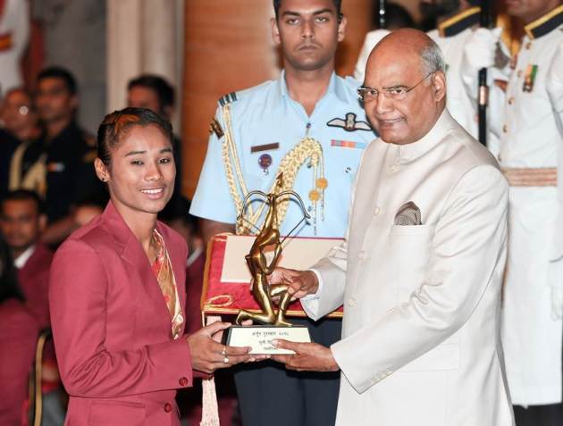 Junior world champion sprinter Hima Das was awarded the Arjuna Award by President Ram Nath Kovind on Tuesday at the National Sports and Adventure Award 2018 function. (PTI Photo)