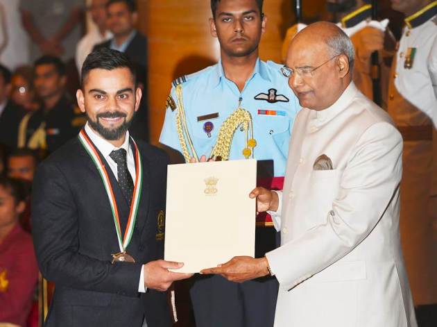Current Indian skipper in all the format of cricket, Virat Kohli on Tuesday was awarded the the Rajiv Gandhi Khel Ratna award by President Ram Nath Kovind at the Rashtrapati Bhawan. The batting maestro, who has single handedly taken India to victory on many occasions, is currently the number one batsman in both ODIs and Tests as per ICC rankings. The 29-year-old has scored 35 centuries in the 50-over format and has 23 tons under his name in Test cricket. In the recently concluded Test series against England, Kohli stood first among the batsmen with 593 runs in 10 innings. (PTI Photo)