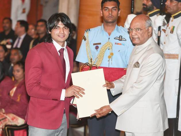 Star javelin thrower Neeraj Chopra received Arjuna Award at the National Sports and Adventure Award 2018 function, at Rashtrapti Bhawan in New Delhi. Chopra, who holds the national record in javelin, bagged twin golds at the Commonwealth and Asian Games held this year. (PTI Photo)