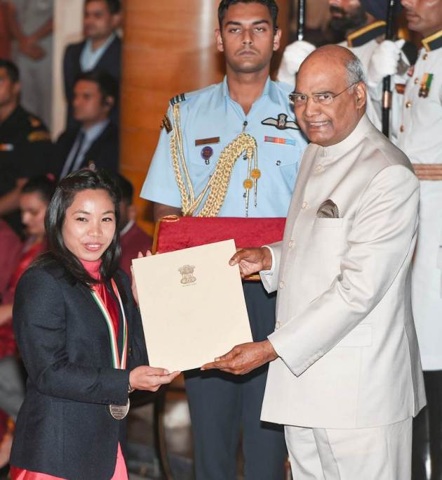 President Ram Nath Kovind confers Rajiv Gandhi Khel Ratna Award on weightlifter Mirabai Chanu at the National Sports and Adventure Award 2018 function at Rashtrapti Bhawan. She won a gold medal in Commonwealth Games (CWG) in 2018. Her achievments also include a gold medal in IWF World championship 2017 and a silver medal in CWG 2014. (PTI Photo)