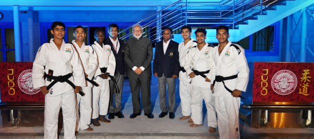 PMO's twitter handle wrote, "Celebrating sports and sportsman spirit. PM @narendramodi joined other world leaders at the Jigoro Kano Judo Tournament. PM also interacted with Indian judo players." (Source: PTI)