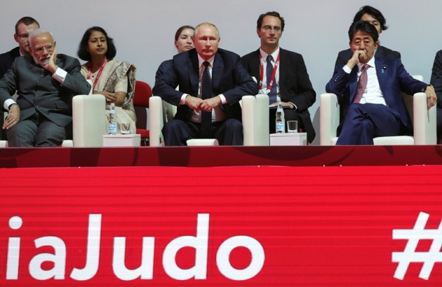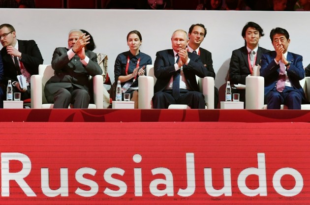 PM Narendra Modi on Thursday attended an international judo tournament along with his Japanese counterpart Shinzo Abe and Russian President Vladimir Putin, and interacted with the Indian players. (Source: PMO Twitter)