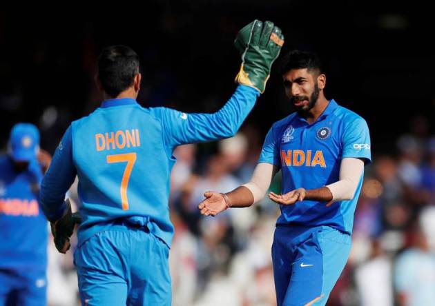 Jasprit Bumrah celebrates Usman Khawaja's wicket with MS Dhoni. Khawaja scored 42 runs from 39 deliveries. (Source: Reuters)