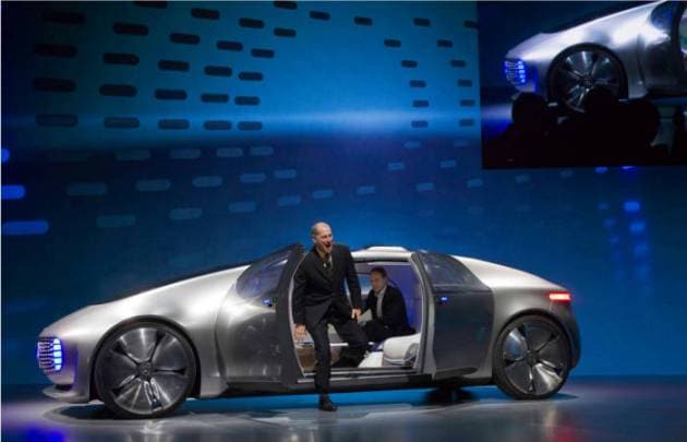 Gary Shapiro (L), president and CEO of the Consumer Electronics Association, steps out of the Mercedes-Benz F015 Luxury in Motion autonomous concept car during the 2015 International Consumer Electronics Show (CES) in Las Vegas. (Source: Reuters)