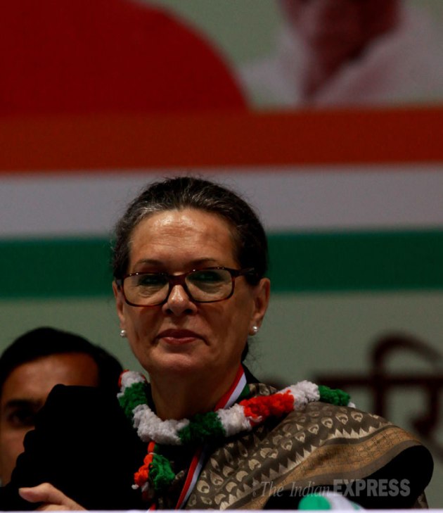 Making a scathing attack on the BJP, Congress President Sonia Gandhi today warned that the country faced the biggest threat from communal forces and their ideology even as the AICC resolution called upon "like-minded political and social forces to come together at this critical juncture". (IE Photo: Renuka Puri)