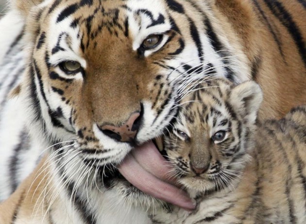 Amur tiger Iris licks its seven-week-old cub during one of their first walks in an open-air cage at the Royev Ruchey zoo in Krasnoyarsk, Siberia, Russia September 29, 2011. (Source: Reuters)