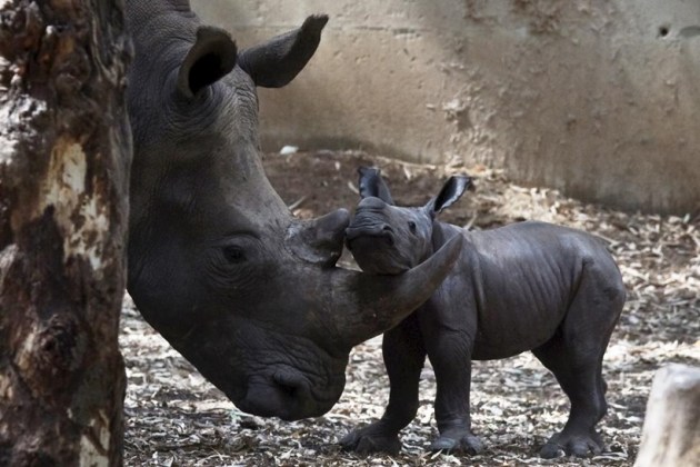 A 10-day-old male rhinoceros calf stands next to its mother Kumi in their enclosure at the zoo in Berlin, Germany October 24, 2014. (Source: Reuters)