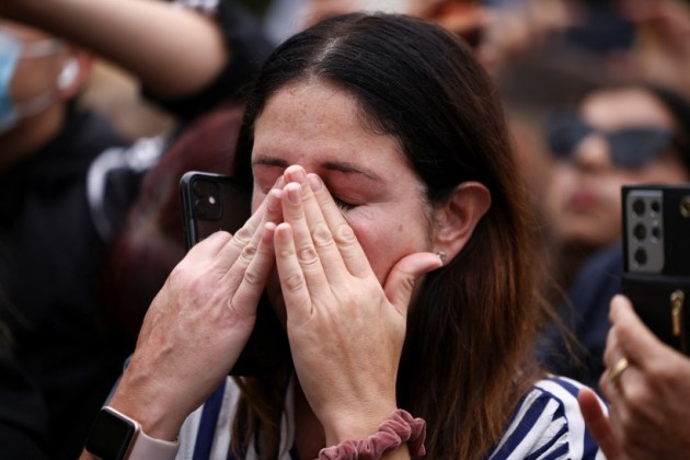 Mourners from across Britain began to gather outside the Buckingham Palace on Friday. In this picture, a mourner is overcome with emotion as she pays respects to the Queen. (Reuters)