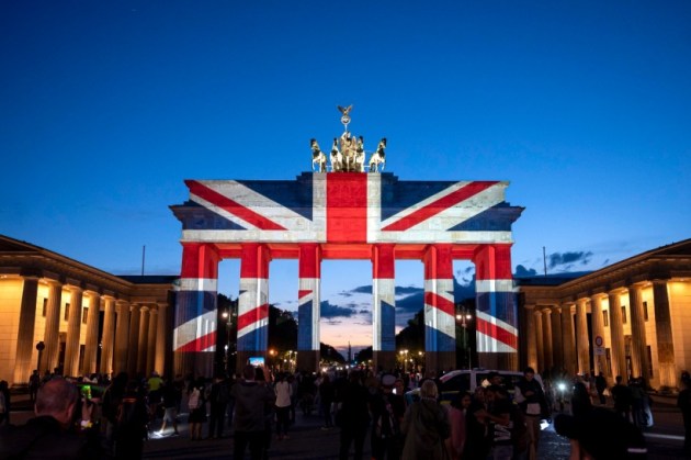 The Brandenburg Gate is illuminated in the colours of the Union Jack to mark the passing of Queen Elizabeth II in Berlin, Germany. (AP)