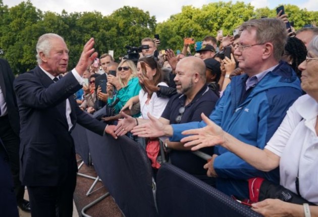 King Charles III will be officially proclaimed as Britain’s new monarch on Saturday during a meeting of the Accession Council in London. King Charles III and Camilla, the queen consort, walk along the fence of Buckingham Palace on Friday as Londoners placed flowers there in tribute to Queen Elizabeth. (Reuters)