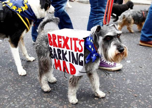 Bulldogs, both English and French breeds, were among those walked through central London to Parliament Square. One grey Schnauzer wore a homemade banner declaring “Brexit’s Barking Mad”. (Source: Reuters)