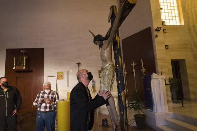 A member of a local Catholic brotherhood looks at a figure of Jesus inside Nuestra Senora de la Candelaria church in Seville. (AP Photo/Laura Leon)