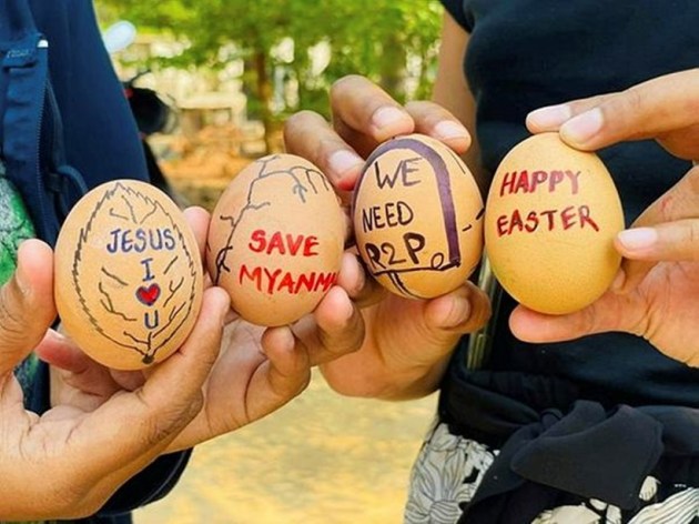 Easter eggs are painted with slogans from the protests against the military coup, in Mandalay, Myanmar April 3, 2021 in this picture obtained by Reuters from social media.