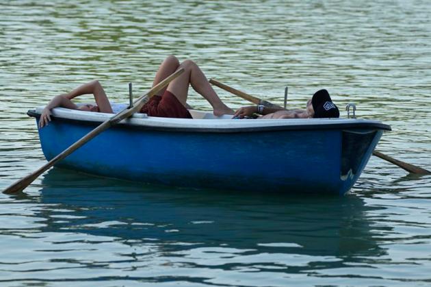 People relax on a boat on the lake in the Retiro park in Madrid, Spain, Saturday, July 16, 2022. (AP Photo/Paul White)