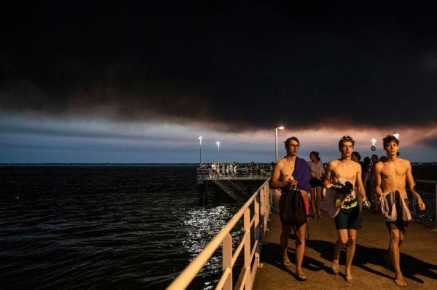 Swimmers walk on the Le Moulleau pier in Arcachon, southwestern France Monday July 18, 2022, as a large cloud of black smoke laden with ashes coming from a giant wildfire consuming the thousand-year-old forest bordering the Dune du Pilat fills the sky. (AP Photo)