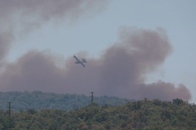 A plan flies above a wildfire in Devetachi, Italy, July 20, 2022. (REUTERS)