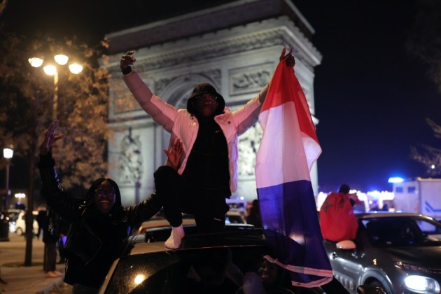 Supporters of France react next to the Arc de Triomphe and the Champs Elysees avenue at the end of the World Cup semifinal soccer match between France and Morocco, in Paris, Wednesday, Dec. 14, 2022. (AP Photo)