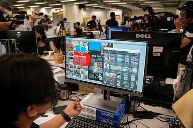 Staff members design their layout for the last edition of the newspaper in the Apple Daily headquarters in Hong Kong, Wednesday, June 23, 2021. The five editors and executives were detained on suspicion of colluding with foreigners to endanger national security. (AP Photo)