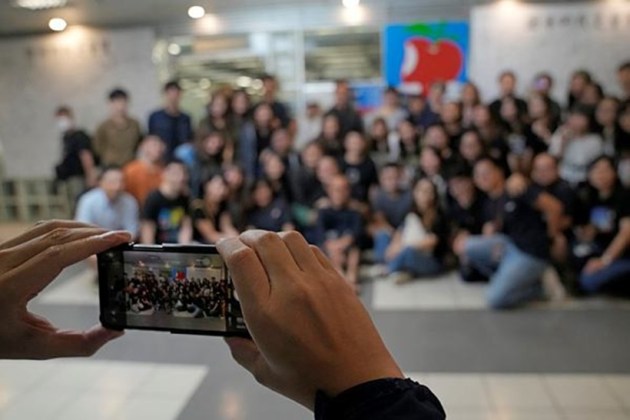 Staff members of Apple Daily pose at the headquarters in Hong Kong, Wednesday, June 23, 2021. (AP Photo)