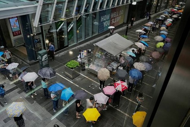 People queue up for the last issue of Apple Daily at a newspaper booth at a downtown street in Hong Kong, Thursday, June 24, 2021. (AP Photo)