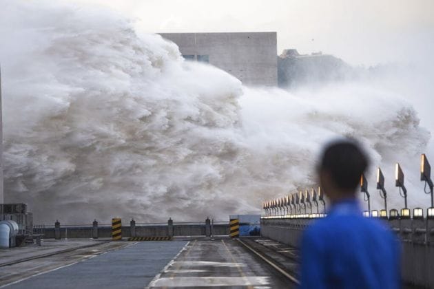 China’s giant dams, designed to contain floods and generate electricity, have come under heavy scrutiny. Floodwater is discharged at the Three Gorges Dam in central China's Hubei province. Authorities in the neighbouring province of Anhui blasted a dam Sunday to release surging waters behind it amid widespread flooding across the country that has claimed scores of lives. (Xiao Yijiu/Xinhua via AP)