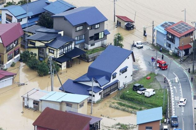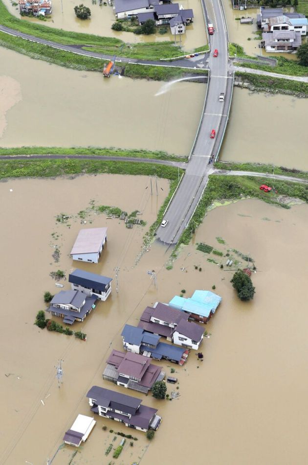 A residential area is flooded following a heavy rain in Oishida town, Yamagata prefecture, northern Japan Wednesday, July 29, 2020. (Kyodo News via AP)