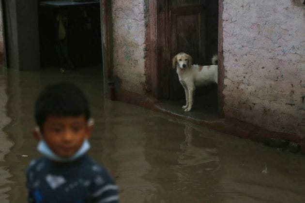 A dog stands at the doorway of a house as a boy walks through a flooded area on the bank of the Bagmati river after water levels receded in Kathmandu, Nepal. The weather department has has forecast heavy rains this week. (AP)