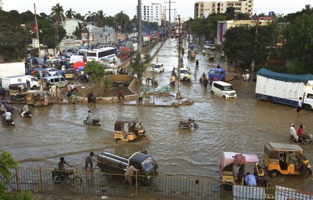 Vehicles drive through a flooded road after a heavy rainfall in Karachi, Pakistan, Monday, July 27, 2020. (AP)