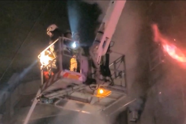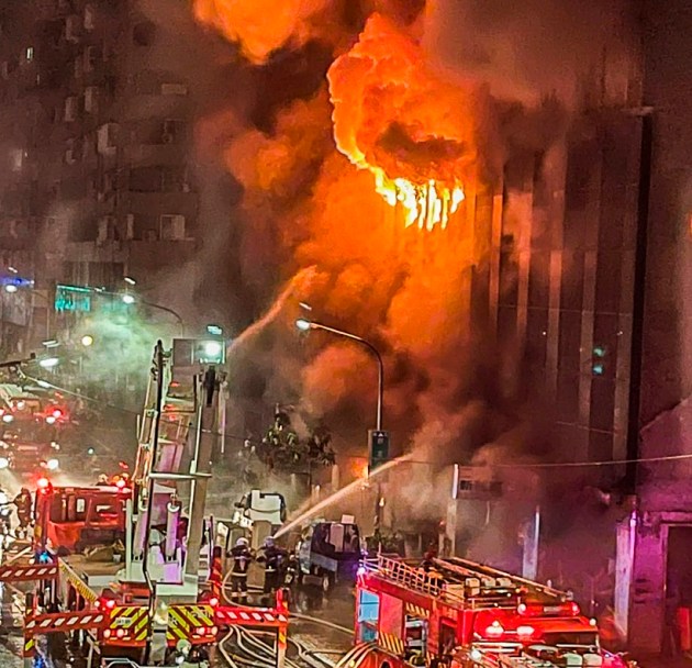 Flames and smoke billowed from the lower floors of the 13-story building as firefighters tried to douse the blaze from the street and aerial platforms in the city of Kaohsiung. A fire department statement described the fire, which started about 3 am, as “extremely fierce” and said several floors had been destroyed. (AP)
