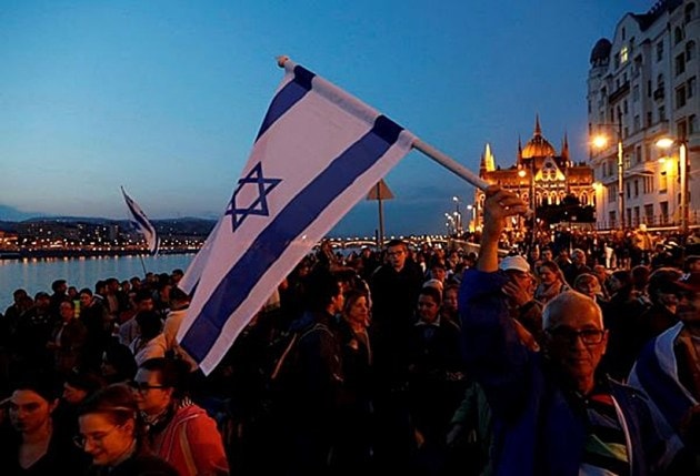 Pro-Israel protesters gather at the 'Shoes on the Danube Bank' memorial. (Reuters)