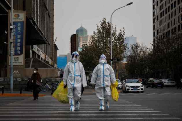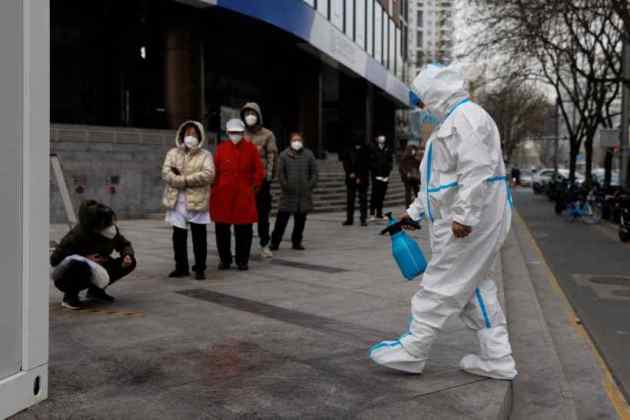 Following the nationwide protests last month, the National Health Commission Wednesday announced the rollback of country’s strict ‘zero-COVID’ policy. In picture, a pandemic prevention worker in a protective suit disinfects the ground as people wait to get their swab test done. (Reuters Photo)