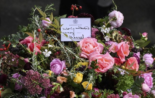A note from Britain's King Charles III is seen with flowers on the coffin of Queen Elizabeth II, draped in the Royal Standard, on the State Gun Carriage of the Royal Navy in London, Monday Sept. 19, 2022. (AP)
