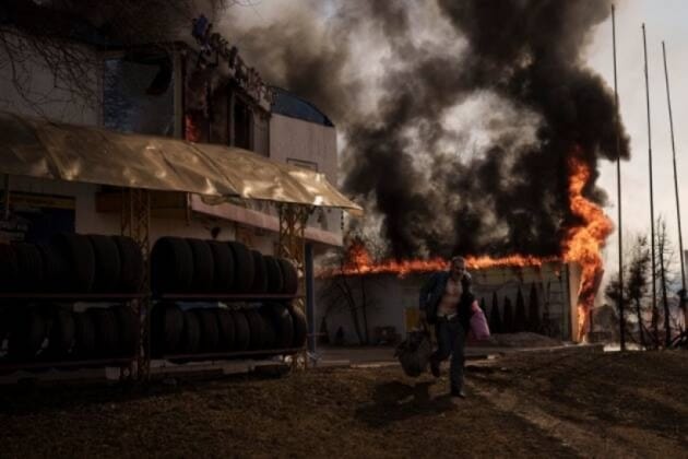 People survey the destruction amid the smoldering remains of a shopping center in Kyiv, Ukraine, following a shelling by Russian forces on March 21, 2022. (Reuters)