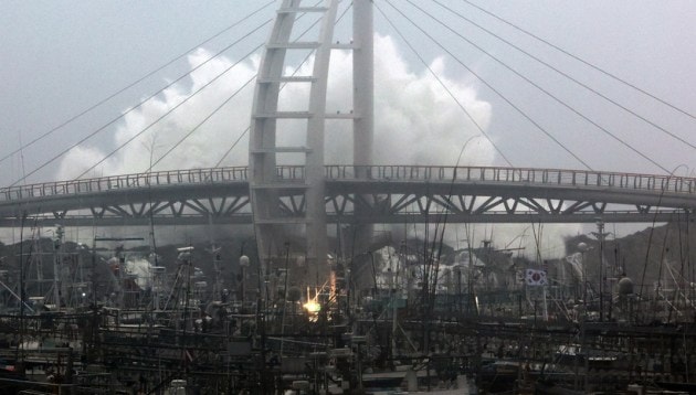 A high wave caused by Typhoon Hinnamnor hits a port on Jeju island. The Safety Ministry said about 3,700 of 4,700 people who had been forced to evacuate returned home Tuesday afternoon. (Reuters)
