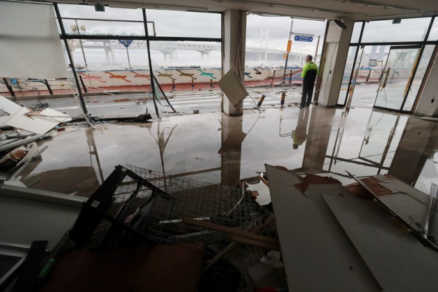 A man stands at a shopping district damaged by Typhoon Hinnamnor in Busan. After grazing the resort island of Jeju and hitting the mainland near the port city of Busan, Hinnamnor weakened as it blew into waters between the Korean Peninsula and Japan. (AP)