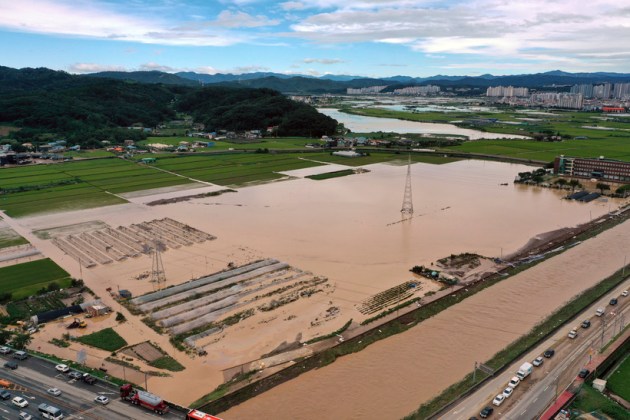Farmland is flooded in the aftermath of Typhoon Hinnamnor at a village in Pohang. Typhoon Hinnamnor made impact just weeks after heavy rain around the capital, Seoul, caused flooding that killed at least 14 people. (AP)