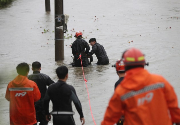 South Korean firefighters rescue a citizen near a river in Ulsan. Thousands of people were forced to evacuate in South Korea as Typhoon Hinnamnor made landfall in the country's southern regions on Tuesday, unleashing fierce rains and winds that destroyed trees and roads, and left more than 20,000 homes without power. (AP)