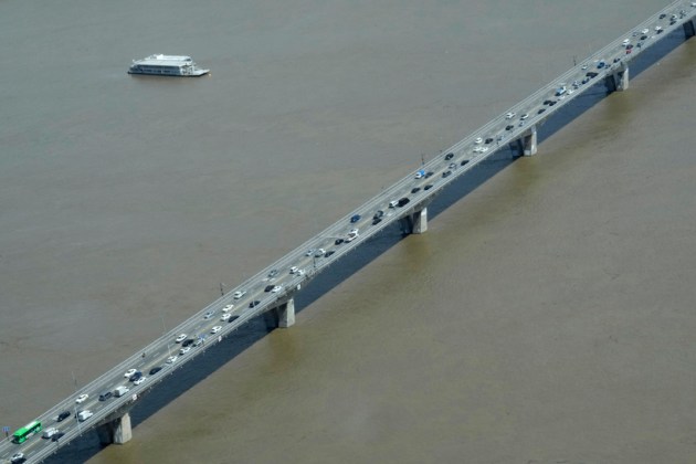 The Han River, swollen with floodwater, flows under a bridge in Seoul. (AP)