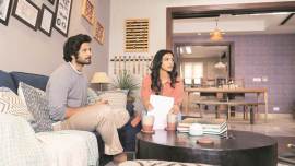 The set takes the audience into the woman’s one-room home, where a cradle is kept near a bed, clothes hang from a wire, a table acts as a kitchen top and a wooden frame as a door.