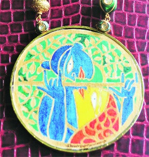 Krishna frolics with Radha in one glittering pendant while in another,a female figure dances with abandon.