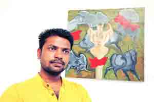 Around a dozen Vadodara Congress members barged into an exhibition held at the Faculty of Fine Arts,M S University,on Friday demanding removal of a painting,which they alleged distorted a national emblem.