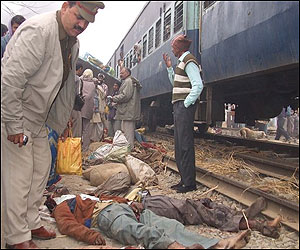 At least 12 pilgrims were killed and 30 others injured as a tractor trolley,they were travelling in,collided with a speeding train at Unchahar railway crossing here early,disrupting rail traffic on the section,police said.