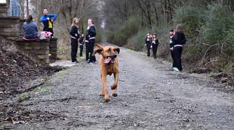 Ludivine, a two-and-a-half year-old pet hound dog, snuck out of her owner’s garden and joined runners at the start of the Trackless Train Trek Half Marathon.