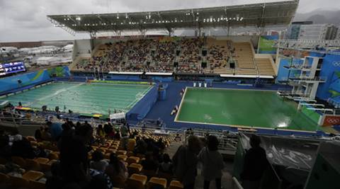 Pool turned into green from its natural blue colour during the women’s 10 metre platform final. (Source: AP)